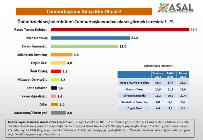 Ankete göre, Cumhurbaşkanı adayı olarak en çok ismi dile getirilen kişi Recep Tayyip Erdoğan oldu. Katılımcıların yüzde 37’si, tercihini Erdoğan’dan yana kullandı.